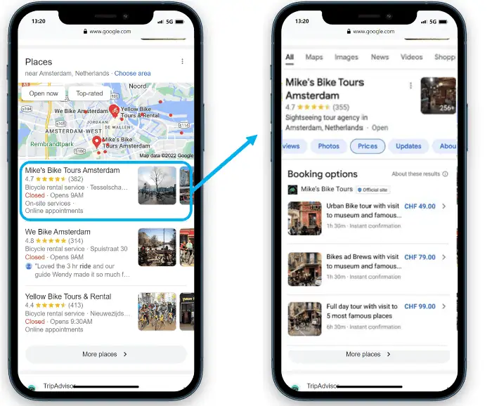 Visibility across Google’s platform for tour and activity operators will continue to expand beyond just points of interest search. As Martinez explains, GTTD connectivity partners can also send tour and activity operators’ data to a new “operator module” that is currently in pilot – where the “Prices” button is activated. This development will allow users to be able to find Tour and Activity operators when they search ‘categorically’ e.g Bike Tours in Amsterdam.
